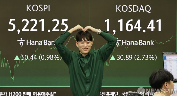[서울=뉴스핌] 양윤모 기자 = 美연준이 금리를 3연속 인하 후 동결한 29일 오후 코스피가 전장 종가보다 50.44 포인트(0.98%) 상승하며 5221.25로, 코스닥은 30.89 포인트(2.73%) 상승한 1164.41로 장을 마감한 가운데, 서울 중구 하나은행본점 딜링룸에서 직원이 축하의 하트를 날리고 있다. 서울외환시장에서 달러/원 환율은 전장 대비 4.30원 상승한 1426.80원에 주간거래를 마감했다. 2026.01.29 yym58@newspim.com