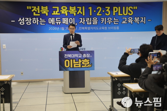[전주=뉴스핌] 이백수 기자 = 이남호 전 전북대학교 총장이 에듀페이 등 기존 보편적 교육복지 틀을 유지하면서 아이의 미래 자립까지 함께 준비하는 '전북 교육복지 1·2·3PLUS' 공약을 내놓았다.