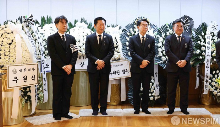 [서울=뉴스핌] 사진공동취재단 = 30일 오전 서울 종로구 서울대학교병원 장례식장에 마련된 故 이해찬 전 국무총리의 빈소에서 정청래 더불어민주당 대표와 조정식 의원, 윤호중 행정안전부 장관이 조문객을 맞이하고 있다. 2026.01.30 photo@newspim.com