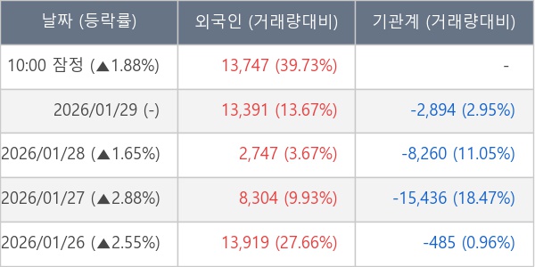 [서울=뉴스핌] 로보뉴스 = 30일 10시 15분 현재 프로텍(053610)은 전일 대비 1.88% (현재가 40,750원) 상승했고, 외국인이 최근 5일 연속 순매수(누적 52,108주, 잠정) 행진을 하고 있다.