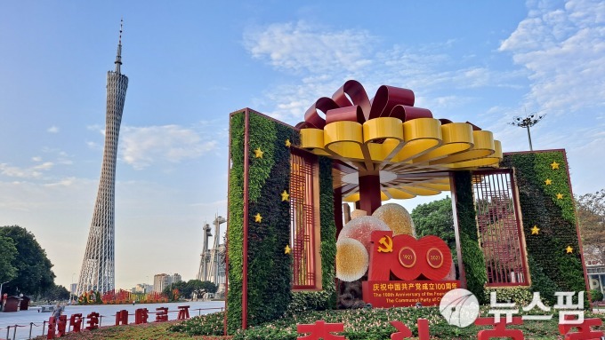 [서울=뉴스핌] 최헌규 중국전문기자= 중국 광둥성 광저우시 '화청 광장'에 공산당 기념 조형물이 설치돼 있다.  잘룩한 허리라는 별명을 가진 광저우 탑이 멀리서 날렵한 자태를 뽐내고 있다. 사진= 뉴스핌 통신사 촬영. 2026.01.30 chk@newspim.com
