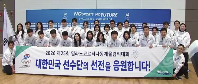 [서울=뉴스핌] 박상욱 기자 = 2026 밀라노·코르티나담페초 동계올림픽에 참가하는 한국선수단 본단이 30일 출국하기 전 기념촬영을 하고 있다. [사진=연합뉴스TV 중계화면 캡처] 2026.01.30 psoq1337@newspim.com