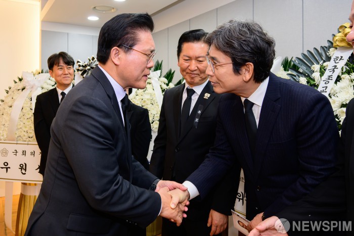 [서울=뉴스핌] 사진공동취재단 = 송석준 국민의힘 의원이 30일 오후 서울 종로구 서울대학교병원 장례식장에 마련된 고(故) 이해찬 전 국무총리의 빈소에서 조문을 마친 뒤 유시민 작가와 악수를 하고 있다. 2026.01.30 photo@newspim.com