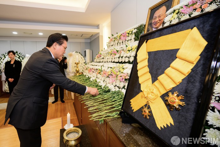 [서울=뉴스핌] 사진공동취재단 = 송석준 국민의힘 의원이 30일 오후 서울 종로구 서울대학교병원 장례식장에 마련된 고(故) 이해찬 전 국무총리의 빈소에서 조문을 하고 있다. 2026.01.30 photo@newspim.com