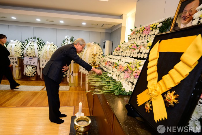 [서울=뉴스핌] 사진공동취재단 = 임종룡 우리금융지주 회장이 30일 오후 서울 종로구 서울대학교병원 장례식장에 마련된 고(故) 이해찬 전 국무총리의 빈소에서 헌화하고 있다. 2026.01.30 photo@newspim.com