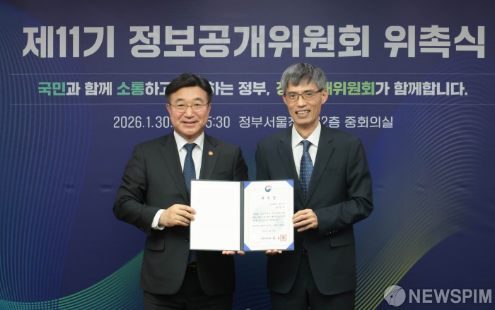 [서울=뉴스핌] 이길동 기자 = 윤호중 행정안전부 장관이 30일 서울 종로구 정부서울청사에서 열린 제11기 정보공개위원회 위촉식에서 남영준 위원장에게 위촉장을 전달하고 있다.2026.01.30 gdlee@newspim.com