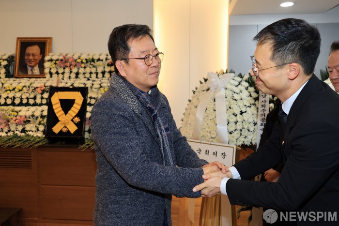 [서울=뉴스핌] 사진공동취재단 = 배우 이기영이 30일 오후 서울 종로구 서울대학교병원 장례식장에 마련된 고(故) 이해찬 전 국무총리의 빈소에서 조문을 마친 뒤 김상욱 더불어민주당 의원과 악수를 나누고 있다. 2026.01.30 photo@newspim.com