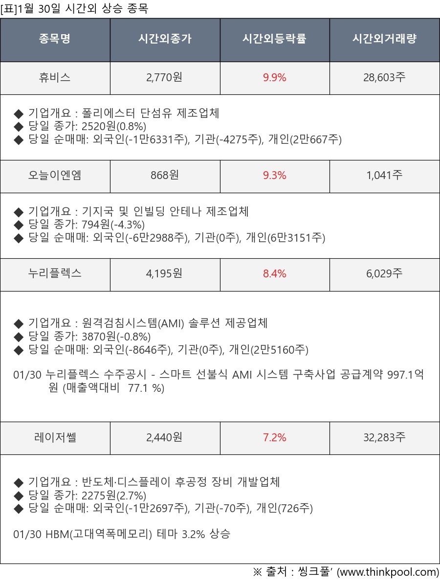 [표]1월 30일 시간외 상승 종목 및 최근 동향