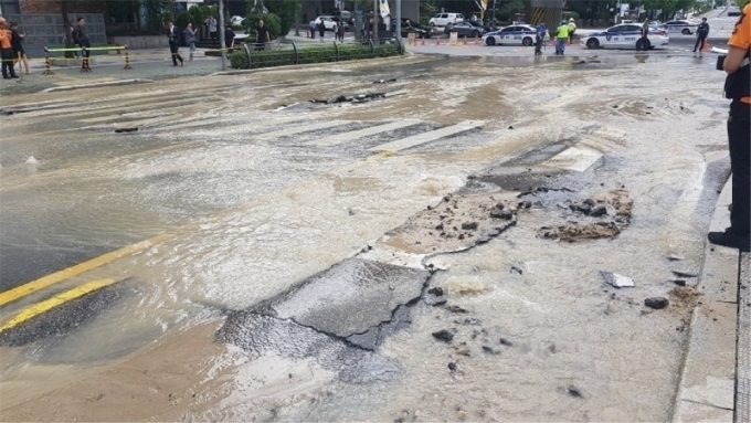 상수도본부는 지하에 묻힌 직경 400㎜ 상수도관에서 누수가 발생한 것으로 추정하고 인근 도로의 3개 차로를 통제하고 이날 낮까지 복구 작업을 벌이고 있다.