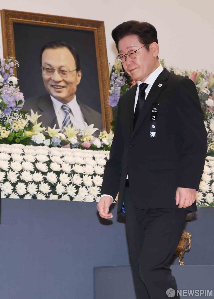 [서울=뉴스핌] 윤창빈 기자 = 이재명 대통령이 31일 오전 서울 여의도 국회 의원회관에서 열린 고(故) 이해찬 전 국무총리 영결식에서 헌화를 마치고 나서고 있다. 2026.01.31 pangbin@newspim.com
