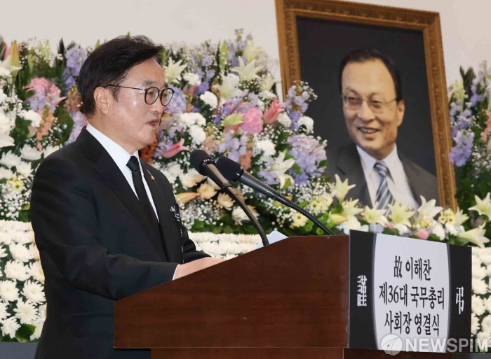 [서울=뉴스핌] 윤창빈 기자 = 우원식 국회의장이 31일 오전 서울 여의도 국회 의원회관에서 열린 고(故) 이해찬 전 국무총리 영결식에서 추도사를 하고 있다. 2026.01.31 pangbin@newspim.com