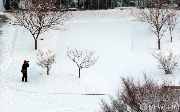 [서울=뉴스핌] 이길동 기자 = 2일 오전 서울 종로구 경복궁을 찾은 관광객이 밤사이 내린 눈을 걸으며 사진을 찍고 있다.다.2026.02.02 gdlee@newspim.com