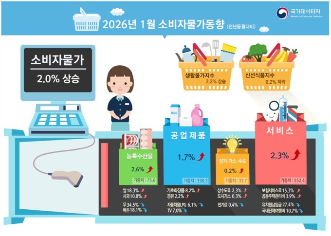 3일 국가데이터처에 따르면 1월 소비자물가지수는 전월대비 0.4%, 전년동월 대비 2.0% 각각 상승했다.