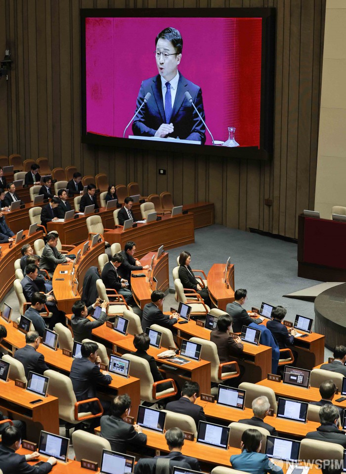 [서울=뉴스핌] 윤창빈 기자 = 한병도 더불어민주당 원내대표가 3일 서울 여의도 국회에서 열린 본회의에서 국정에 관한 교섭단체 대표연설을 하고 있다. 2026.02.03 pangbin@newspim.com
