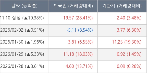 [서울=뉴스핌] 로보뉴스 = 03일 11시 30분 현재 아이에스티이(212710)는 전일 대비 10.38% (현재가 10,950원) 상승했고, 기관이 최근 5일 연속 순매수(누적 18.43만 주, 잠정) 행진을 하고 있다.