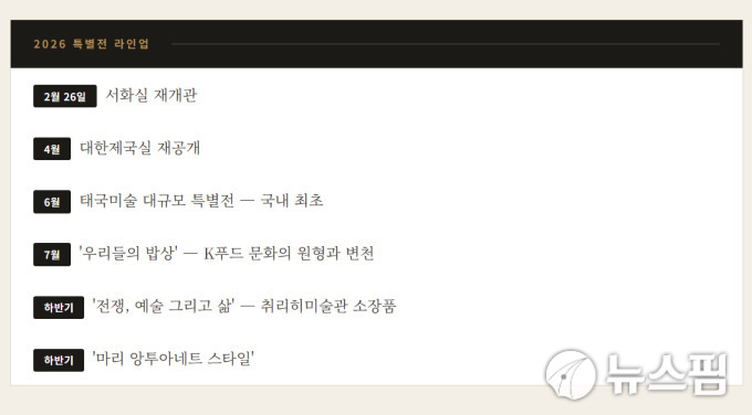 6월에는 국내 최초의 대규모 '태국미술' 전시가 열린다. 하반기에는 스위스 취리히미술관 소장품을 중심으로 한 근대 유럽 미술전 '전쟁, 예술 그리고 삶'과 '마리 앙투아네트 스타일' 전이 잇달아 오픈된다. 상설전시 역시 서화실 재개관(2월 26일), 대한제국실을 재공개(4월)한다.
