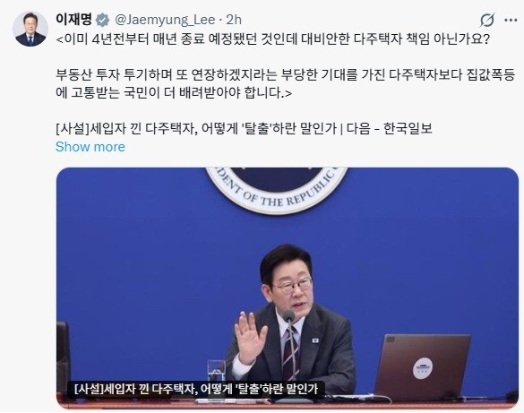 이 대통령은 이날 오전 엑스(X·옛 트위터)에 '세입자가 있는 다주택자, 어떻게 '탈출'하란 말인가'라는 제목의 언론 사설을 공유하며 이같이 지적했다. 일각에서 세입자와 임대차 계약을 맺고 있는 다주택자의 경우 빠른 매매가 현실적으로 어렵다는 주장을 내놓자 이를 반박한 것이다.