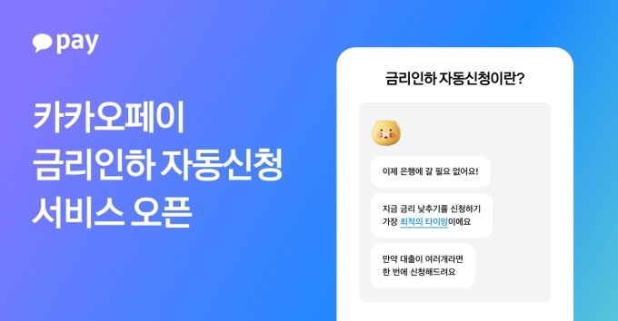 [서울=뉴스핌] 정광연 기자 = 카카오페이(대표 신원근)는 사용자의 대출 이자를 낮출 수 있는 최적의 시기를 포착해 자동으로 신청해 주는 '금리인하 자동신청' 서비스를 시작한다고 4일 밝혔다.