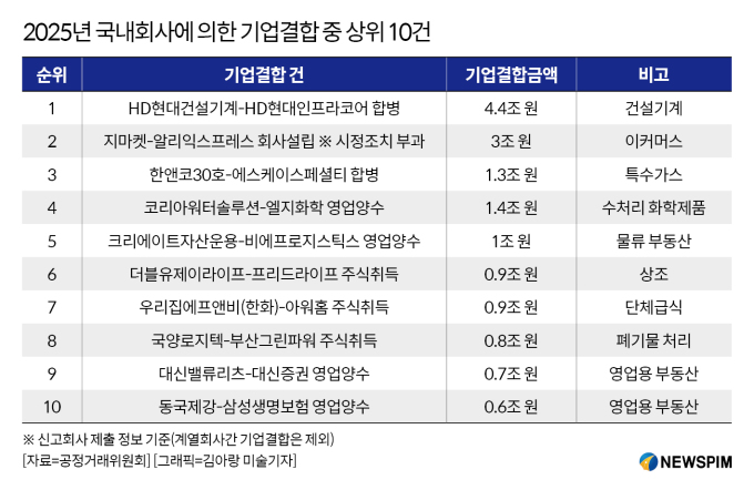 한편 지난해 국내 기업결합 가운데 금액 기준 최대 거래는 'HD현대건설기계-HD현대인프라코어' 합병(4조4000억원)이었다. 국외 기업 중에서는 반도체 설계 소프트웨어 기업 시놉시스의 앤시스 인수(50조원)나 제과업체 마즈의 켈라노바 인수(49조원) 등에 대한 결합 심사도 진행됐다. 공정거래법상 국내 매출액의 규모가 300억원 이상인 경우 외국 기업 간 대규모 기업결합에 대해서도 심사할 수 있도록 하고 있다.