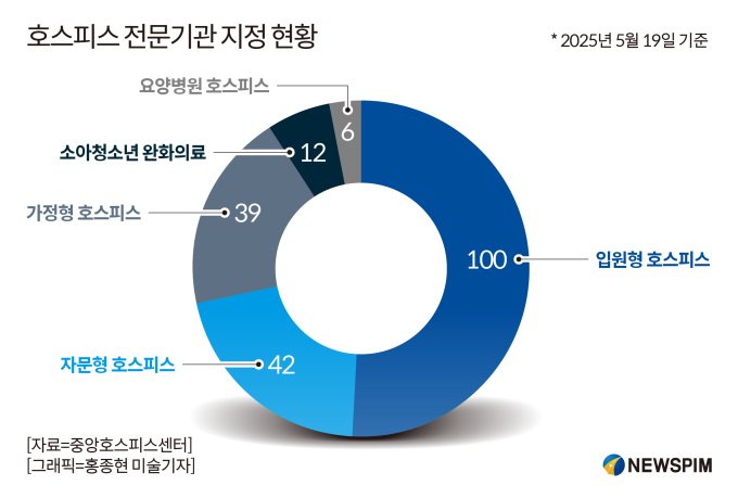 중앙호스피스센터의 호스피스 전문기관 지정 현황에 따르면 2025년 기준 호스피스 전문기관은 전체 202곳이다. 이 중 입원형이 103개로 가장 많았다. 요양병원 6개, 가정형 39개, 자문형 42개, 소아청소년 완화의료 12개다.