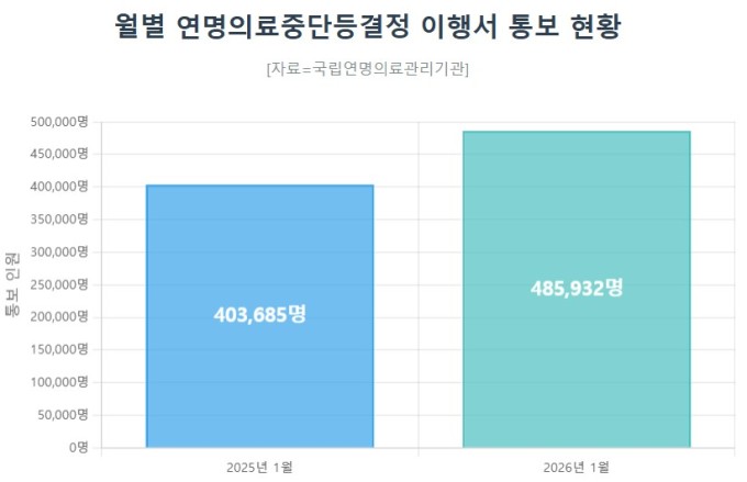 그러나 존엄한 삶에 대한 관심이 높아지면서 연명의료를 중단하고 싶어하는 사람들이 늘고 있다. 국립연명의료관리기관에 따르면 지난해 1월 연명의료중단 결정 이행자 수는 40만3685명이었으나 올해 1월 연명의료중단 결정 이행자 수는 48만5932명으로 늘었다. 연령대가 높아질수록 연명의료중단 결정 이행이 높은 추세도 나타났다.