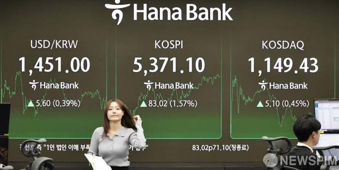 [서울=뉴스핌] 양윤모 기자 = 4일 오후 코스피가 전장 종가보다 83.02 포인트(1.57%) 상승하며 5371.10으로, 코스닥은 5.10 포인트(0.45%) 상승한 1149.43 으로 거래를 마감한 가운데, 서울 중구 하나은행본점 딜링룸에서 직원들이 업무를 보고 있다. 서울외환시장에서 달러/원 환율은 전장 대비 5.60원 상승한 1451.00원에 주간거래를 마감했다. 2026.02.04 yym58@newspim.com
