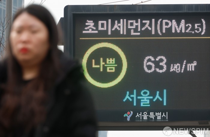 [서울=뉴스핌] 류기찬 기자 = 수도권의 초미세먼지 농도가 나쁨 수준을 보인 5일 오전 서울 중구 시청역 인근 전광판에 초미세먼지 농도가 표시되고 있다. 2026.02.05 ryuchan0925@newspim.com