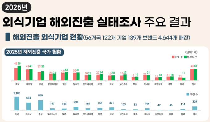 실태조사에 따르면 국내 외식기업은 미국과 중국, 베트남 등 전 세계 56개국에 진출해 총 4644개 매장을 운영 중이다. 해외 진출 기업은 122개, 브랜드는 139개로 집계됐다.