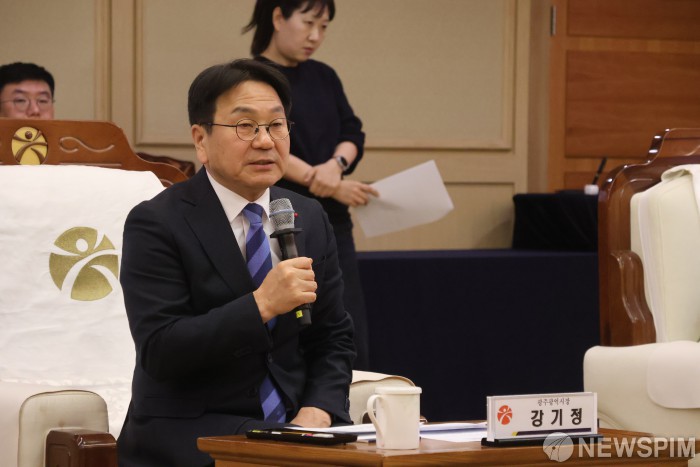 [광주=뉴스핌] 박진형 기자 = 강기정 광주시장이 5일 오전 청사 비즈니스룸에서 열린 광천터미널 복합화사업 관련 투자양해각서 체결식에서 인사말을 하고 있다. 2026.02.05 bless4ya@newspim.com
