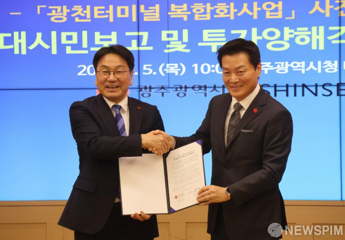 [광주=뉴스핌] 박진형 기자 = 강기정 광주시장(왼쪽)과 박주형 신세계 대표이사가 5일 오전 광주시청 비즈니스룸에서 광천터미널 복합화사업 관련해 투자양해각서를 체결한 뒤 기념 촬영을 하고 있다.2026.02.05 bless4ya@newspim.com