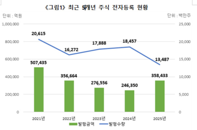 [서울=뉴스핌] 윤채영 기자 = 지난해 전자 등록 방식으로 발행된 주식은 총 134억8700만주, 발행금액은 35조8433억원으로 집계됐다. 전년 대비 발행 수량은 줄었지만 발행 금액은 늘었다.