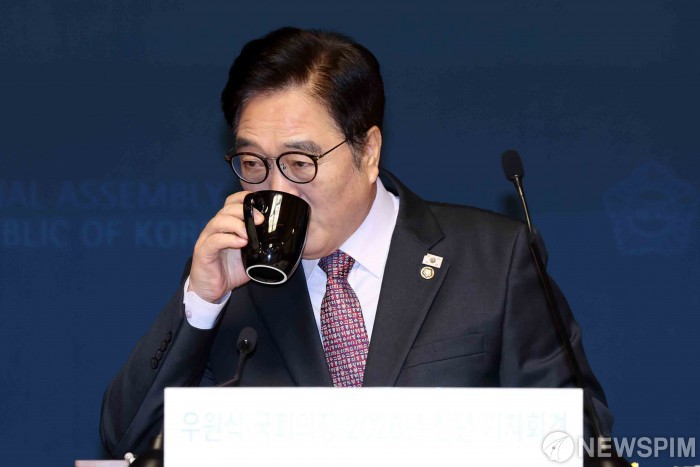 [서울=뉴스핌] 윤창빈 기자 = 우원식 국회의장이 5일 오전 국회 사랑재에서 열린 신년 기자회견에서 물을 마시고 있다. 2026.02.05 pangbin@newspim.com