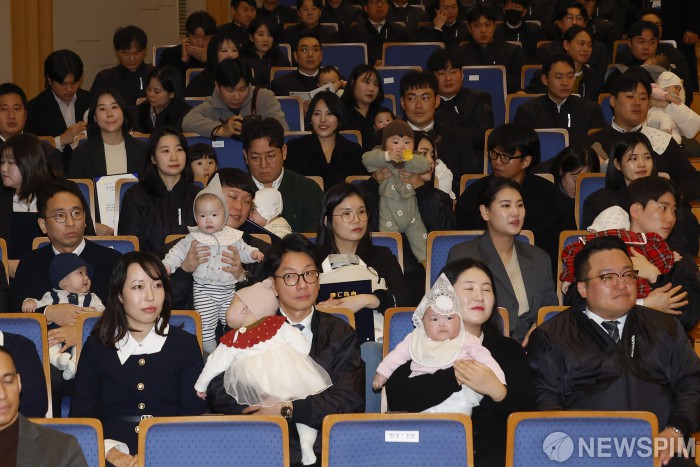 [서울=뉴스핌] 류기찬 기자 = 부영그룹 임직원들이 5일 오전 서울 중구 부영태평빌딩에서 열린 2026년 부영그룹 시무식 및 출산장려지원·19단 경연대회에서 이중근 회장의 신년사를 경청하고 있다. 2026.02.05 ryuchan0925@newspim.com