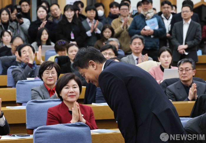 [서울=뉴스핌] 윤창빈 기자 = 토론회를 공동 주최한 오세훈 서울시장이 5일 서울 여의도 국회 의원회관에서 열린 시내버스 필수공익사업 지정 토론회에서 인사를 하고 있다. 2026.02.05 pangbin@newspim.com