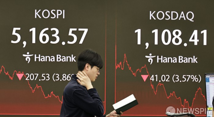 한국거래소에 따르면 이날 코스피 지수는 전 거래일 대비 207.53포인트(3.86%) 떨어진 5163.57에 거래를 마쳤다. 개인이 8조2201억원을 순매수했지만 외국인과 기관이 각각 5조9391억원, 2조5933억원을 순매도하며 지수 하락을 주도했다.