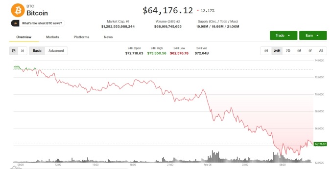 코인데스크에 따르면 한국시간 기준 6일 오전 6시경 비트코인 가격은 6만 2576.78달러까지 떨어졌다. 이후 8시 21분 현재 6만 4198.08달러로 24시간 전보다 12.14% 하락 중이다.