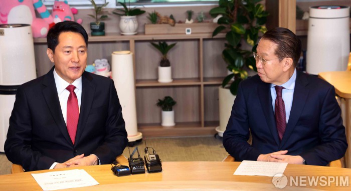 [서울=뉴스핌] 윤창빈 기자 = 오세훈 서울시장과 권영세 국민의힘 의원이 6일 오전 서울 중구 시청 시장 집무실에서 용산국제업무지구 관련 논의를 하고 있다. 2026.02.06 pangbin@newspim.com