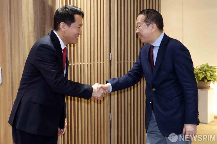 [서울=뉴스핌] 윤창빈 기자 = 오세훈 서울시장과 권영세 국민의힘 의원이 6일 오전 서울 중구 시청 시장 집무실에서 용산국제업무지구와 관련한 논의에 앞서 인사를 나누고 있다. 2026.02.06 pangbin@newspim.com