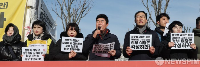 [서울=뉴스핌] 이형석 기자 = 한국중소상인자영업자총연합회, 전국서비스산업노동조합연맹, 전국택배노동조합 등 단체들이 6일 오전 서울 여의도 국회 앞에서 정부 - 여당의 대형마트 새벽배송 허용 규탄 기자회견을 열고 있다. 2026.02.06 leehs@newspim.com