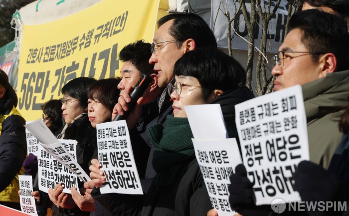 [서울=뉴스핌] 이형석 기자 = 한국중소상인자영업자총연합회, 전국서비스산업노동조합연맹, 전국택배노동조합 등 단체들이 6일 오전 서울 여의도 국회 앞에서 정부 - 여당의 대형마트 새벽배송 허용 규탄 기자회견을 열고 있다. 2026.02.06 leehs@newspim.com