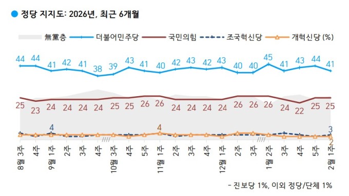 정당 지지도는 더불어민주당이 41%로 3%p 내려갔고, 국민의힘은 25%로 동일했다. 무당층은 26%로 2%p 올랐다.