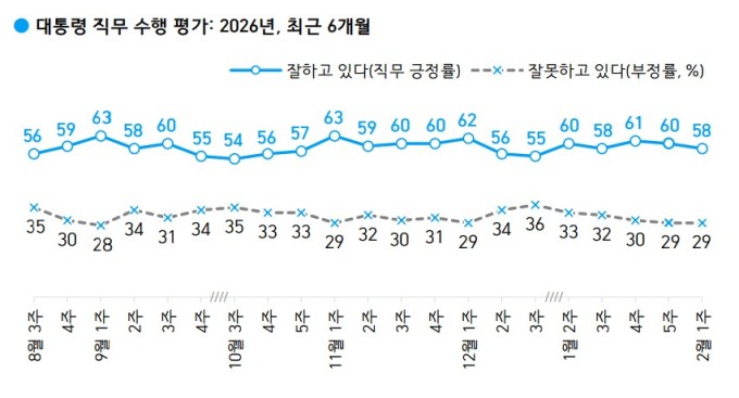 한국갤럽이 지난 3~5일 실시해 6일 공개한 2월 1주차 대통령 직무 수행 평가 결과를 살펴보면, 이 대통령이 국정 수행을 '잘 하고 있다'는 긍정 평가는 58%로 1월 5주차와 비교해 2%포인트(p) 하락했다. '잘 못하고 있다'는 부정 평가는 29%로 동일했다.
