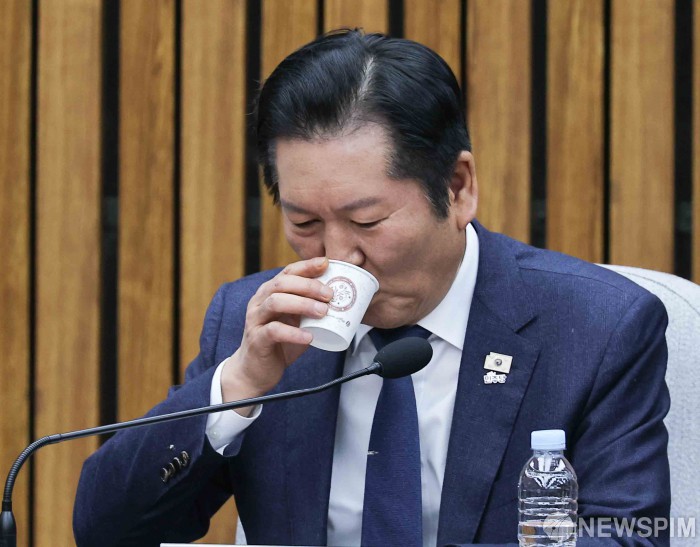 [서울=뉴스핌] 윤창빈 기자 = 정청래 더불어민주당 대표가 6일 서울 여의도 국회에서 열린 조국혁신당 합당 관련 3선의원 간담회에서 물을 마시고 있다. 2026.02.06 pangbin@newspim.com
