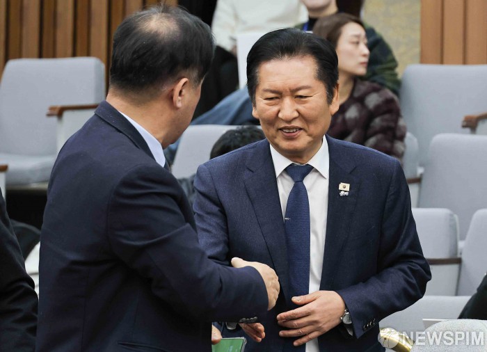 [서울=뉴스핌] 윤창빈 기자 = 정청래 더불어민주당 대표가 6일 서울 여의도 국회에서 열린 조국혁신당 합당 관련 3선의원 간담회에서 맹성규 의원과 인사하고 있다. 2026.02.06 pangbin@newspim.com