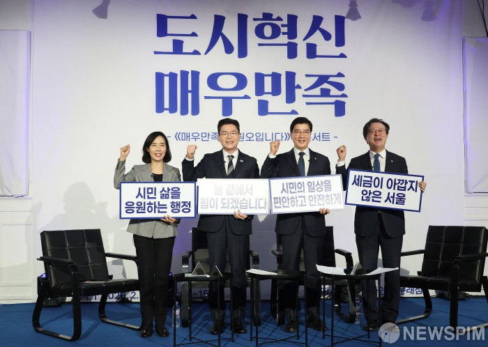 [서울=뉴스핌] 정일구 기자 = 정원오 성동구청장이 8일 오후 서울 영등포구 올댓마인드 문래에서 열린 '매우만족, 정원오입니다' 북콘서트에서 서울시장 공식 출마 선언을 마친 뒤 참석자들과 기념촬영을 하고 있다. 왼쪽부터 박경미 더불어민주당 대변인, 정 구청장, 이해식 의원, 채현일 의원. 2026.02.08 mironj19@newspim.com