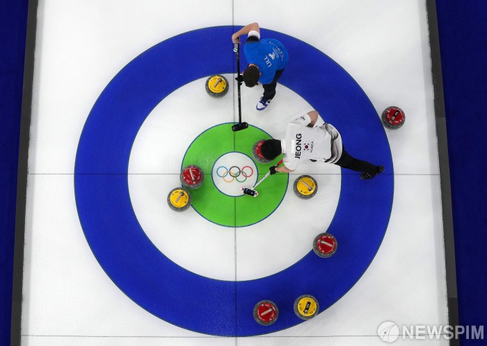 [코르티나담페초=로이터뉴스핌] 밀라노-코르티나 2026 동계올림픽 컬링 믹스더블 라운드로빈에서 대한민국 정영석과 김선영, 에스토니아 하리 릴과 마리 칼드베가 8일(현지시간) 이탈리아 코르티나담페초 코르티나 컬링 올림픽 스타디움에서 경기를 펼치고 있다. 2026.02.08 photo@newspim.com