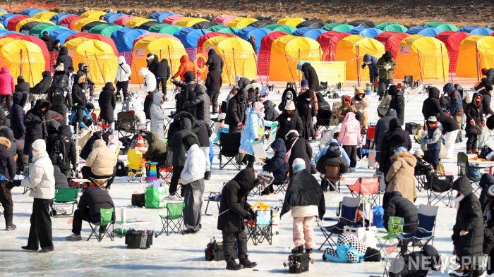 [서울=뉴스핌] 휴일인 8일 오후 강추위에도 불구하고 강원도 평창군 진부면 오대천 일원에 열린 '평창송어축제'에 많은 방문객이 몰려 송어얼음낚시를 즐기고 있다. 9일 폐막하는 올해 축제는 축제조직위원회에 따르면 기간 동안 모두 25만 여명이 방문, 22억 여 원의 매출을 올린 것으로 나타났다. [사진=평창관광문화재단] 2026.02.08 photo@newspim.com