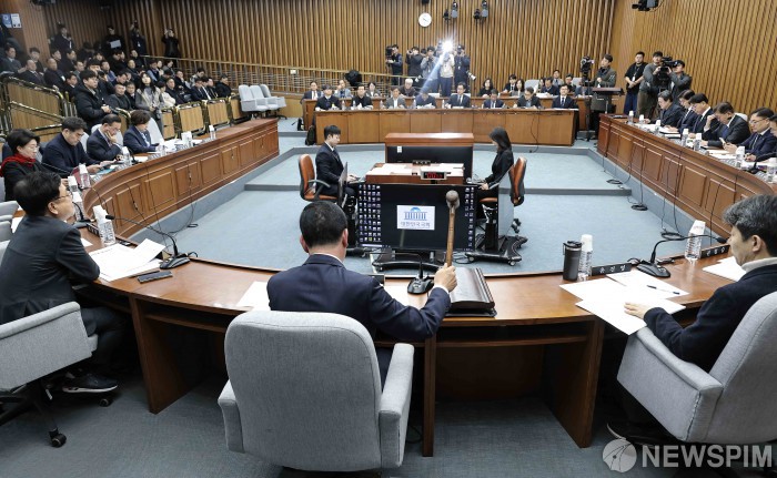 [서울=뉴스핌] 윤창빈 기자 = 신정훈 국회 행정안전위원장이 9일 오전 서울 여의도 국회 행정안전위원회에서 열린 행정구역 통합 관련 제정법률안에 대한 입법공청회에서 의사봉을 두드리고 있다. 2026.02.09 pangbin@newspim.com