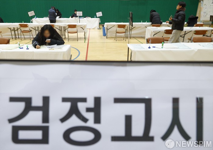 [서울=뉴스핌] 류기찬 기자 = 2026년도 제1회 초·중·고졸 검정고시 응시 원서 접수일인 9일 오후 서울 동작구 서울공업고등학교 체육관을 찾은 검정고시 응시생들이 원서를 작성하고 있다. 2026.02.09 ryuchan0925@newspim.com