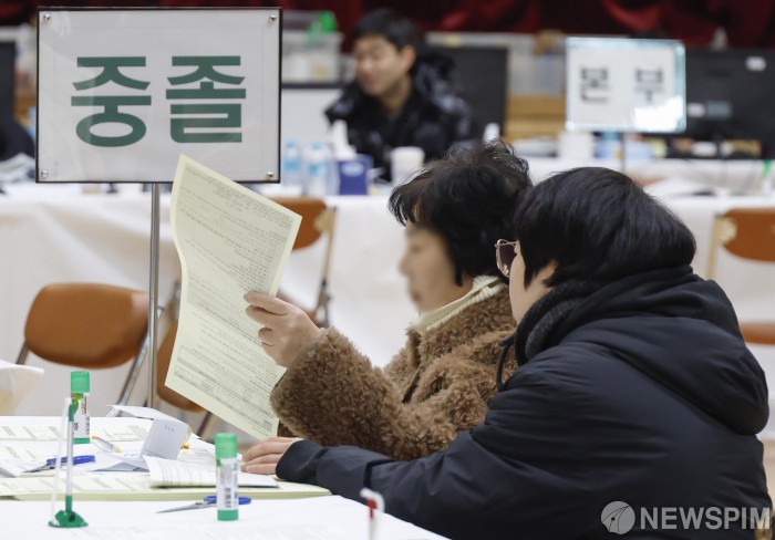[서울=뉴스핌] 류기찬 기자 = 2026년도 제1회 초·중·고졸 검정고시 응시 원서 접수일인 9일 오후 서울 동작구 서울공업고등학교 체육관을 찾은 검정고시 응시생들이 원서를 작성하고 있다. 2026.02.09 ryuchan0925@newspim.com
